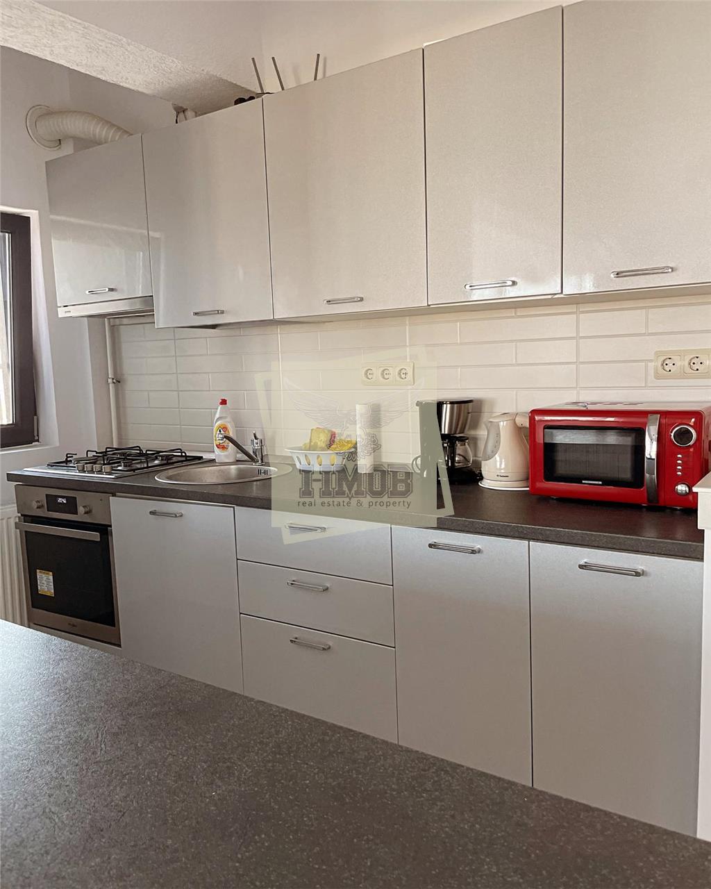 -in continuare avem living-ul complet mobilat cu bucataria de tip open-space dotata cu electrocasnice, inclusiv aer conditionat